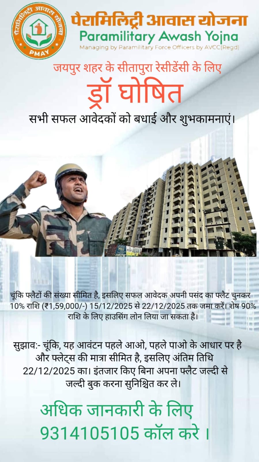 Based on the experience gained from the immense success of defence awash vikash yojna in varioius locations in india, we are introduces its second platform namely PARAMILITARY AWASH YOJNA, which is fully managed by Retired officers from Paramilitary to cater the fulfilment of requirement for housing for Paramilitary personnel in various locations.